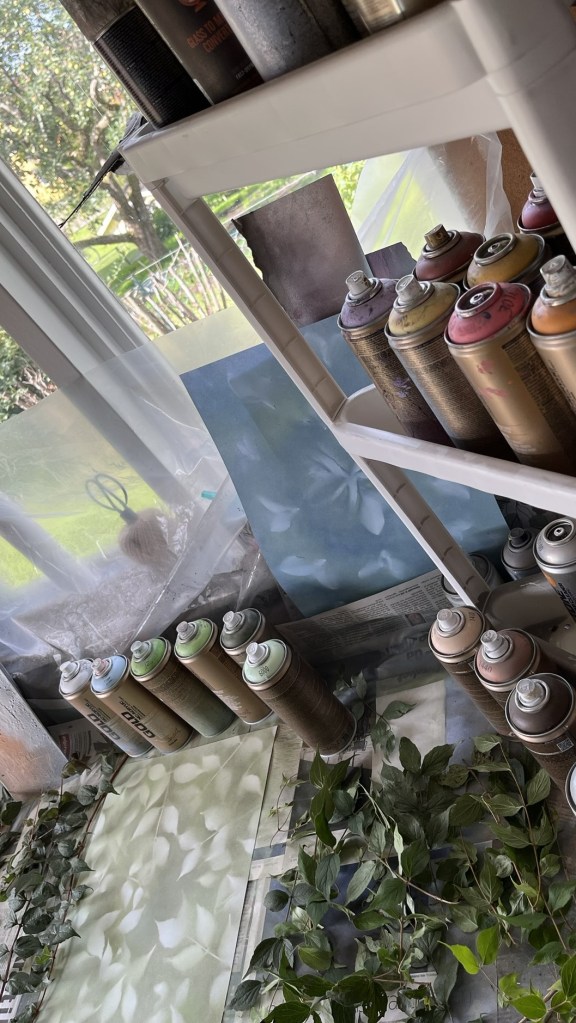 It started when I got the idea to spray paint flowers to use as an ornament. From that, a new idea about a screen wall was born. Soon, I was painting on canvases and spray paint became my medium.